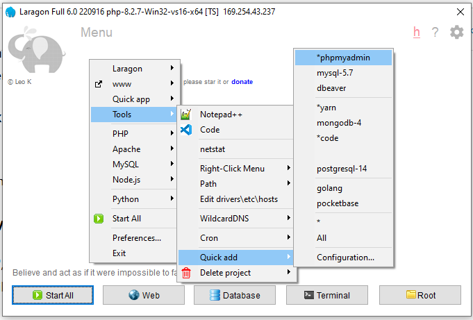 Sekarang, mari kita bahas cara menginstal phpMyAdmin menggunakan Laragon. Laragon adalah lingkungan pengembangan yang sangat mudah digunakan untuk PHP, dan menginstal phpMyAdmin di dalamnya sangatlah sederhana. Yuk, ikuti langkah-langkah berikut!